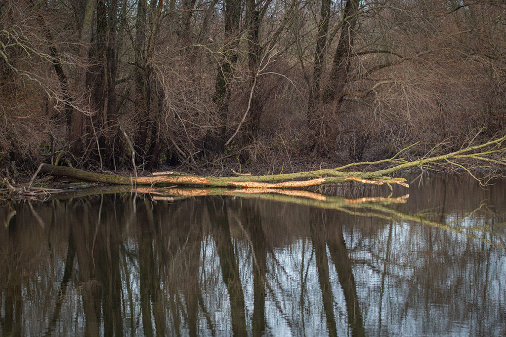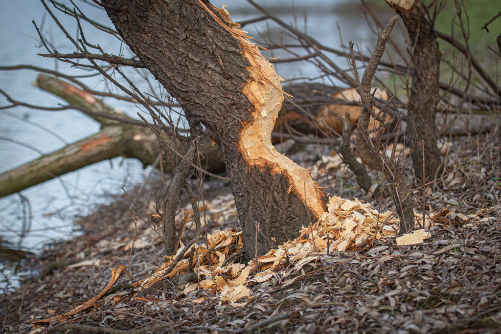 Volop sporen van de bever te bewonderen hier! En nog hele verse ook, zo te zien. Bevers voeden zich namelijk in de wintermaanden met boomschors. Vooral die lange boomstam die net boven de wateroppervlakte lag (middelste foto) was natuurlijk een kolfje naar de hand van dit ijverige knaagdier.