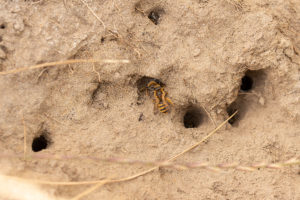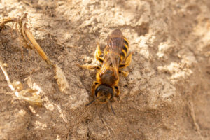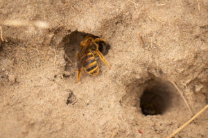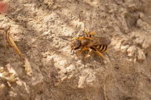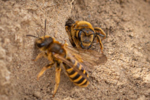 Het hoogwater zal niet het enige gevaar zijn. Rond het nest van de bijen zwierf een ander – gevaarlijk uitziend – insect rond: de bijenwolf (zie foto links). Die heet zo omdat de vrouwtjes van deze soort bijen vangen. Dat doen ze door erboven te gaan vliegen en op het juiste moment toe te slaan. De verlamde bijen worden dan in het nest van de bijenwolf gebracht om te dienen als voer voor de larven. De mannetjes bijenwolven willen niets weten van deze gruwelijke parktijken, die houden het liever bij nectar.