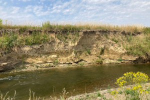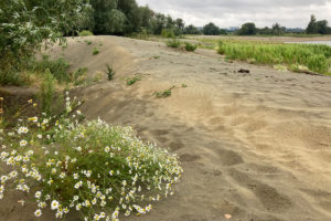 Een jaar geleden ging het hier enorm tekeer, toen het juist heel hoogwater was. Indrukwekkende getuigenissen daarvan troffen we aan in Kerkeweerd (aan de Vlaamse kant); metershoge zandafzettingen en een kolkgat. Het zand komt grotendeels uit de Maasbodem. Het snelstromende water erodeerde de bovenste grindlaag tot aan een onderliggend zandpakket. Dit zand werd, tot wel 15 a 20 meter diepte, meegenomen en op een luwer stuk neergelegd. Gaaf voor geografen om door zo’n recent gevormd landschap verrast te worden. Rivierdynamiek ten top!
