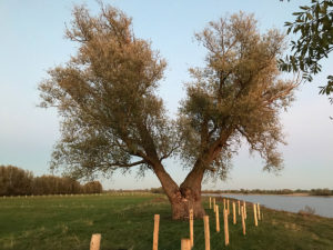 En de bomen? Enkel wilgen? Nee, dat niet, maar erg soortenrijk zijn de Waaluiterwaarden niet. Hoewel, mijn collega Robert ontdekte aan de zuidzijde een aantal fantastische Spaanse aken en een reusachtige koraalmeidoorn. Beide soorten waren nog niet eerder langs de Waal gevonden. Hij vond ze, en misschien is dat wel de verklaring waarom ze juist daar stonden, op een oude veedreef, een mogelijk eeuwenoud landschapselement. Het grootste deel van de uiterwaarden is en wordt immers nog steeds stevig op de schop genomen. En laat ik dan niet vergeten te noemen een 114 jaar oude zwarte populier in Opijnen, een reusachtige es met prachtig laag hangende takken in Neerijnen en de schietwilg vol verhalen op de veerstoep van Varik.