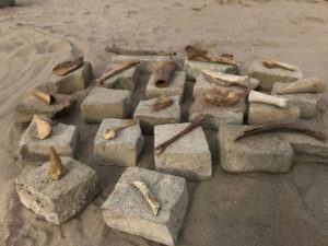 Genieten ook van wat ik op het strand tegenkwam: de manieren waarop de schelpen door het water gerangschikt waren, de ontdekking van een oude gebakken pijpkop en midden op het strand een waar kunstwerk: composities van allerlei materialen variërend van aardewerk, metalen, botten van dieren en tentakels van zongebakken klei. De wonderlijke wereld van de uiterwaarden waar ver van de rivier, in wilgenopslag verscholen, een grote metalen roeiboot lag. De boot stond vreemd genoeg nog vol water, bedekt met een dikke laag kroos.