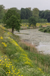 We lopen langs de kleine nevengeul met aangrenzende rij knotbomen. Deze zijn tijdens de graafwerkzaamheden behouden. De hier woonachtige steenuil huist er nog steeds. We ontdekten er in juli 2019 zelfs een… kanarie. Maar die zal vast en zeker ontsnapt zijn en geniet nu met volle teugen van zijn vrije leventje.