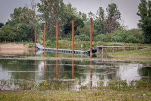 We komen bij een nieuwe loopbrug, veel hoger dan de oude brug en dus ook bij hoger water te gebruiken. De langsdam vlakbij Opijnen is daar in de jaren ’90 door RWS neergelegd als experiment met verschillende soorten verharding. Hij wordt veel gebruikt door vissers en recreanten. In het achterland voelen ganzen en andere watervogels zich thuis.