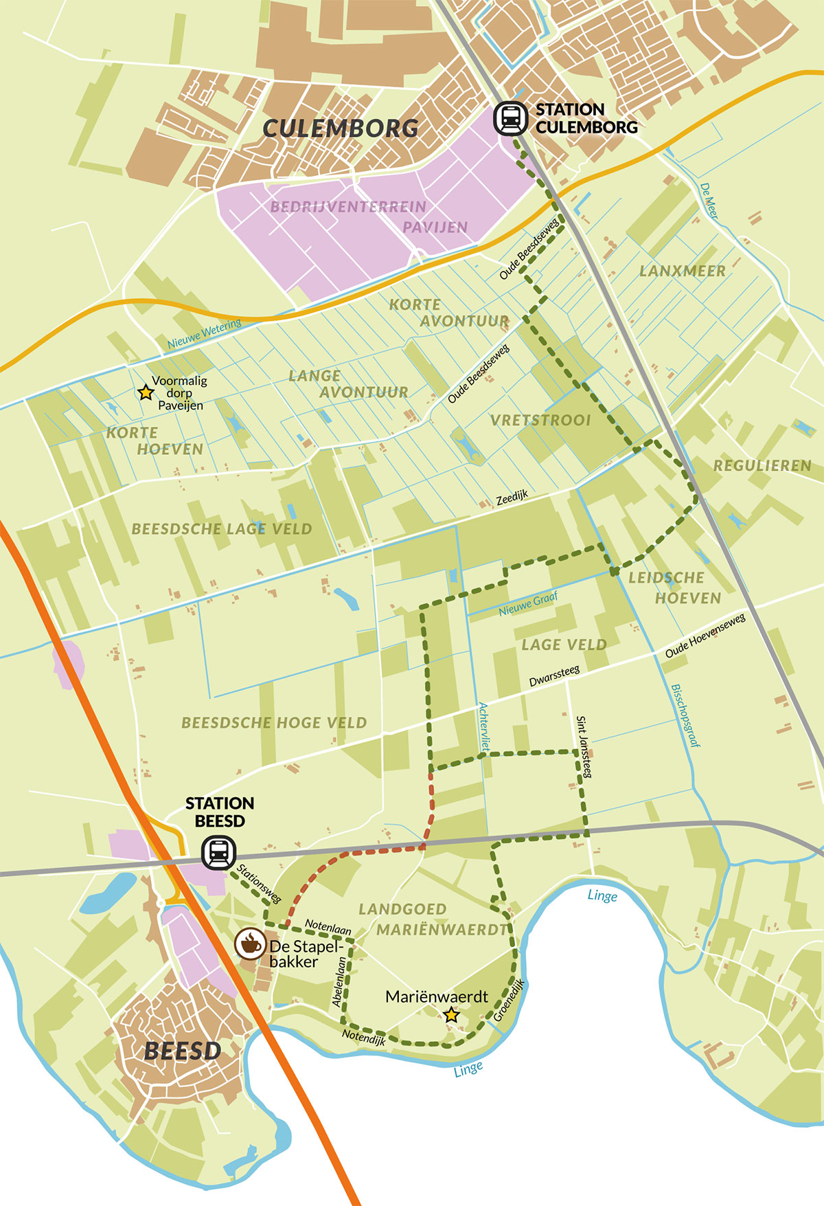 De route brengt je in het hart van de Betuwe. Vanaf station Culemborg wandel je in 14,5 km naar station Beesd. Via rustige asfaltweggetjes verlaat je Culemborg en al snel loop je over mooie onverharde paden. Je betreedt hier het gebied van de komgronden, de natte laaggelegen gronden achter stroomruggen van de rivieren. Overstromingen waren hier vroeger schering en inslag. Die natte grond was uiteraard moeilijk te gebruiken voor de landbouw en daarom vind je hier veel grienden, weidegronden en eendenkooien. En juist omdat het altijd zo’n moeilijk gebied was, heerst hier nog altijd rust. Sommige boerderijen staan op eeuwenouden terpen (of woerden, zoals ze hier heten). Zo hielden de boeren de voeten droog.