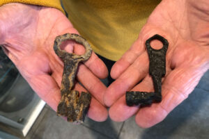 Andere objecten die in Maurik en omgeving werden gevonden zie je hieronder: Romeinse sleutels, een ploegschoen (een zware ijzeren punt aan een stok om mee te ploegen), terra sigilata en ander aardewerk. Het olielampje dat in Kesteren werd gevonden is nog in een goede staat.