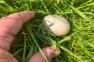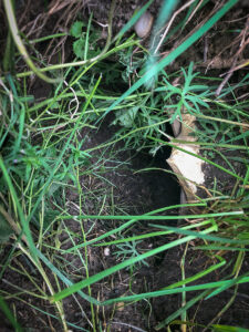 Na onderzoek zijn de skeletten weer ondergedekt met aarde, dus je ziet er niets van. Of… toch? Een door een dier (hond, vos?) gegraven gat laat een stukje skelet zien (zie de foto onder). Het lijkt een paardenbot te zijn. Navraag bij een bevriende archeoloog leert dat dit zeker een mogelijkheid is.