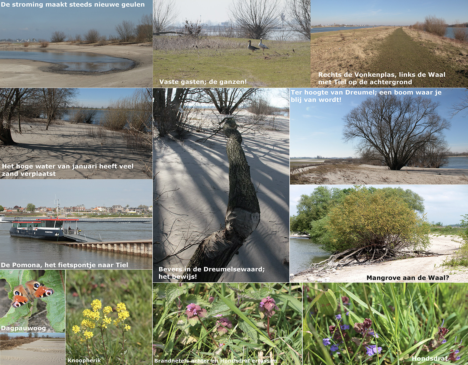 Ton stelde voor een keer af te spreken en eens mee te lopen met een bestaand groepje. Zo gezegd zo gedaan. We spraken af bij het Veerhuis waar Ton met zijn groepje net was aangekomen vanuit Tiel met het veerpontje. We maakten een grote wandeling door de Dreumelse uiterwaarden van ongeveer 9 kilometer lang rond de Vonkerplas en helemaal tot aan het kanaal naar de scheepswerf. We beleefden van alles en Ton weet er werkelijk veel over te vertellen, op zeer boeiende en humoristische wijze.