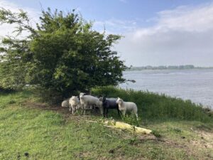 Een schapenweide (zie je niet vaak aan de Waal) en in de Heesseltsche uiterwaarden de kudde Hereford runderen en Koniks, allen met jonkies.